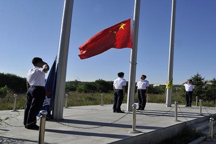 伴隨著廣播介紹大連海事大學(xué)與錦州航星集團(tuán)校企合作的深厚情誼,我們?nèi)嗪图瘓F(tuán)所有員工已經(jīng)整齊的站在了國(guó)旗前,等待著國(guó)旗升起的莊嚴(yán)時(shí)刻。